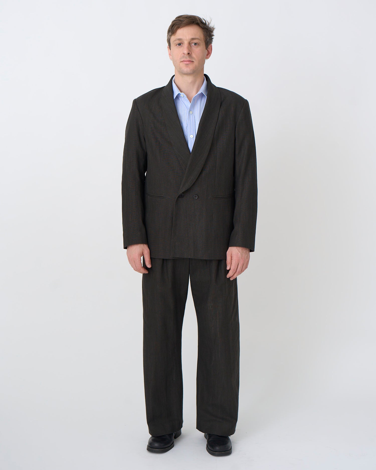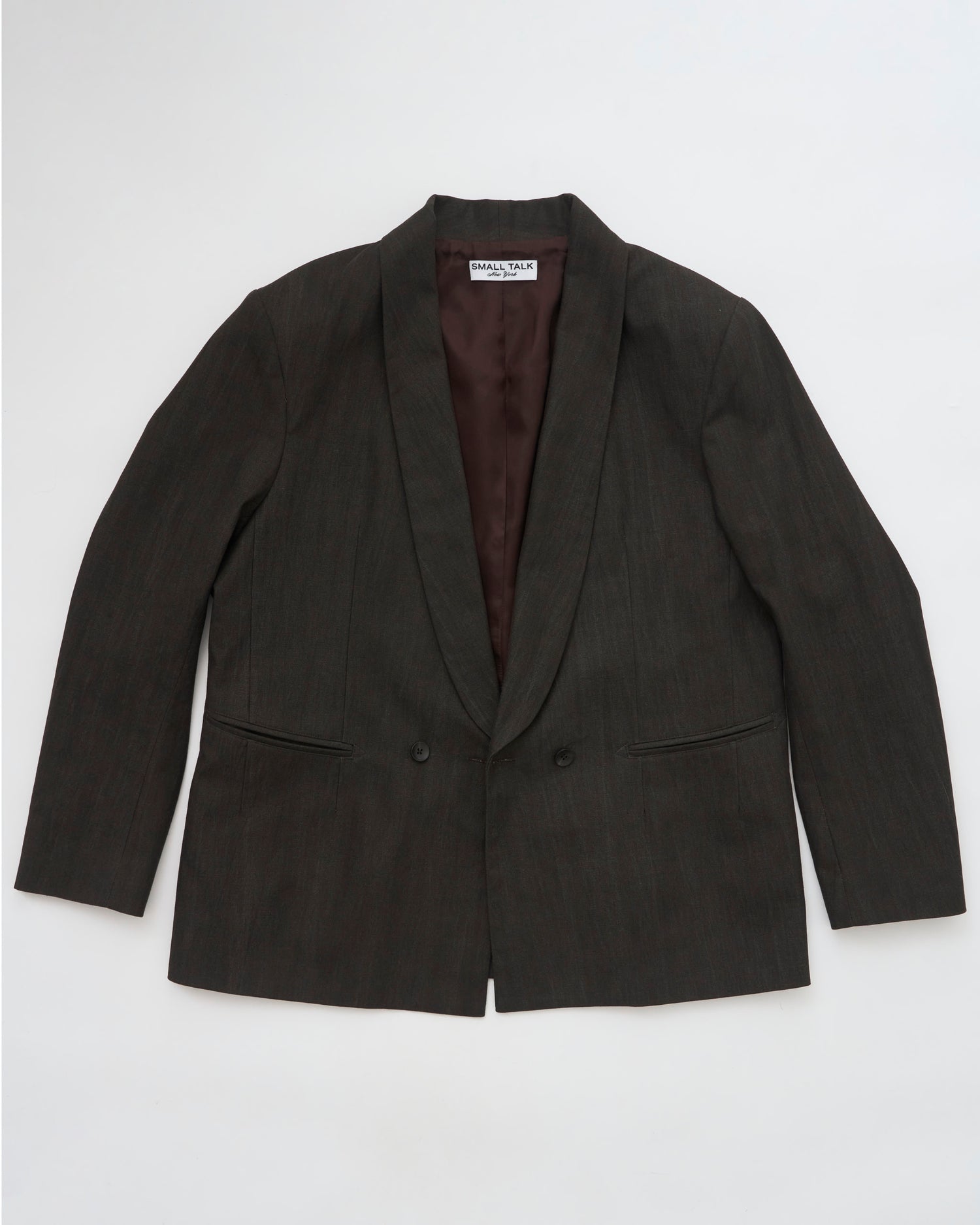 Our relaxed and lightly tailored double breasted blazer with a shawl collar cut in a 9 oz. Japanese Sumi-dyed cotton/linen canvas and fully lined with a tonal Bemberg fabric.