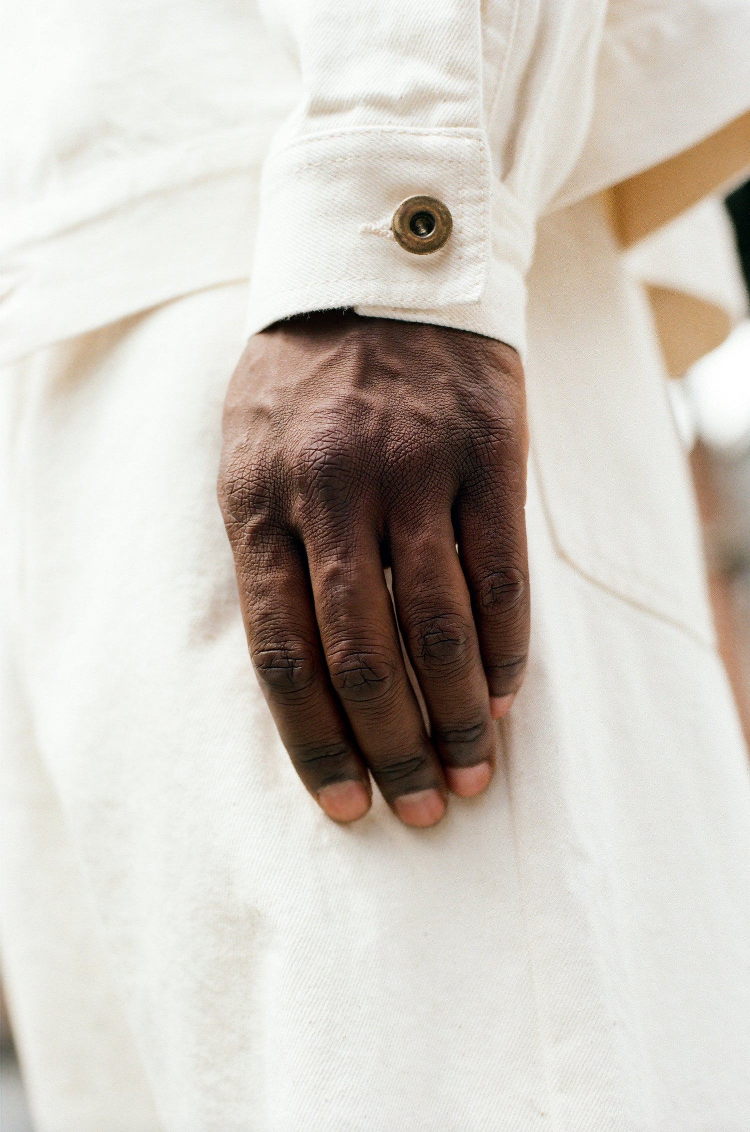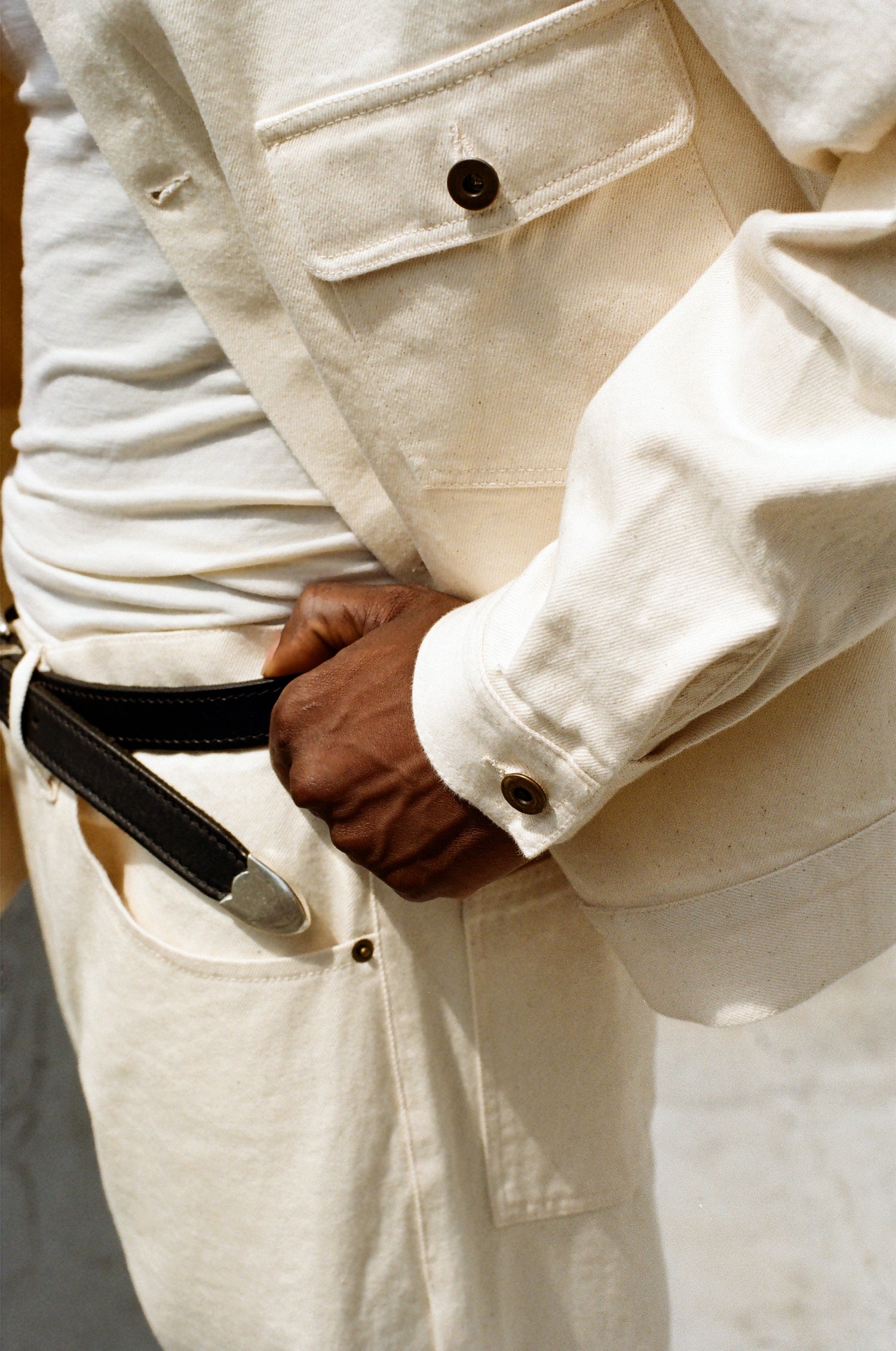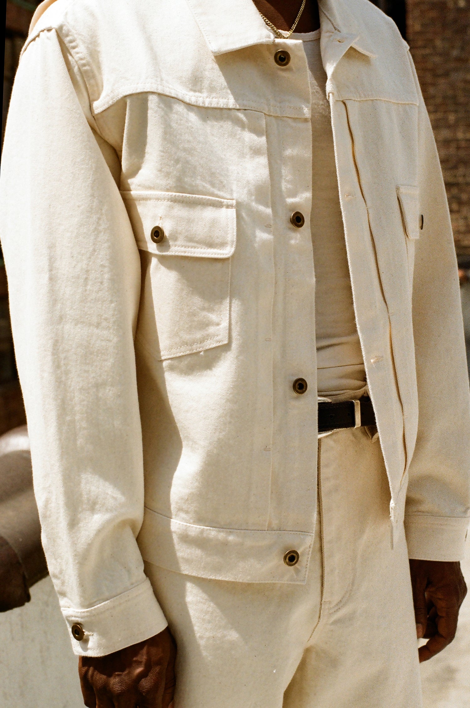 Made from a 12oz Japanese organic cotton twill that is buttery soft and has a really nice drape. It is a bit lighter weight than your average denim jacket, and it is not as stiff either. It has a single pleat down each side with bar tacks and two patch pockets. The jacket has a boxy fit and is slightly cropped.