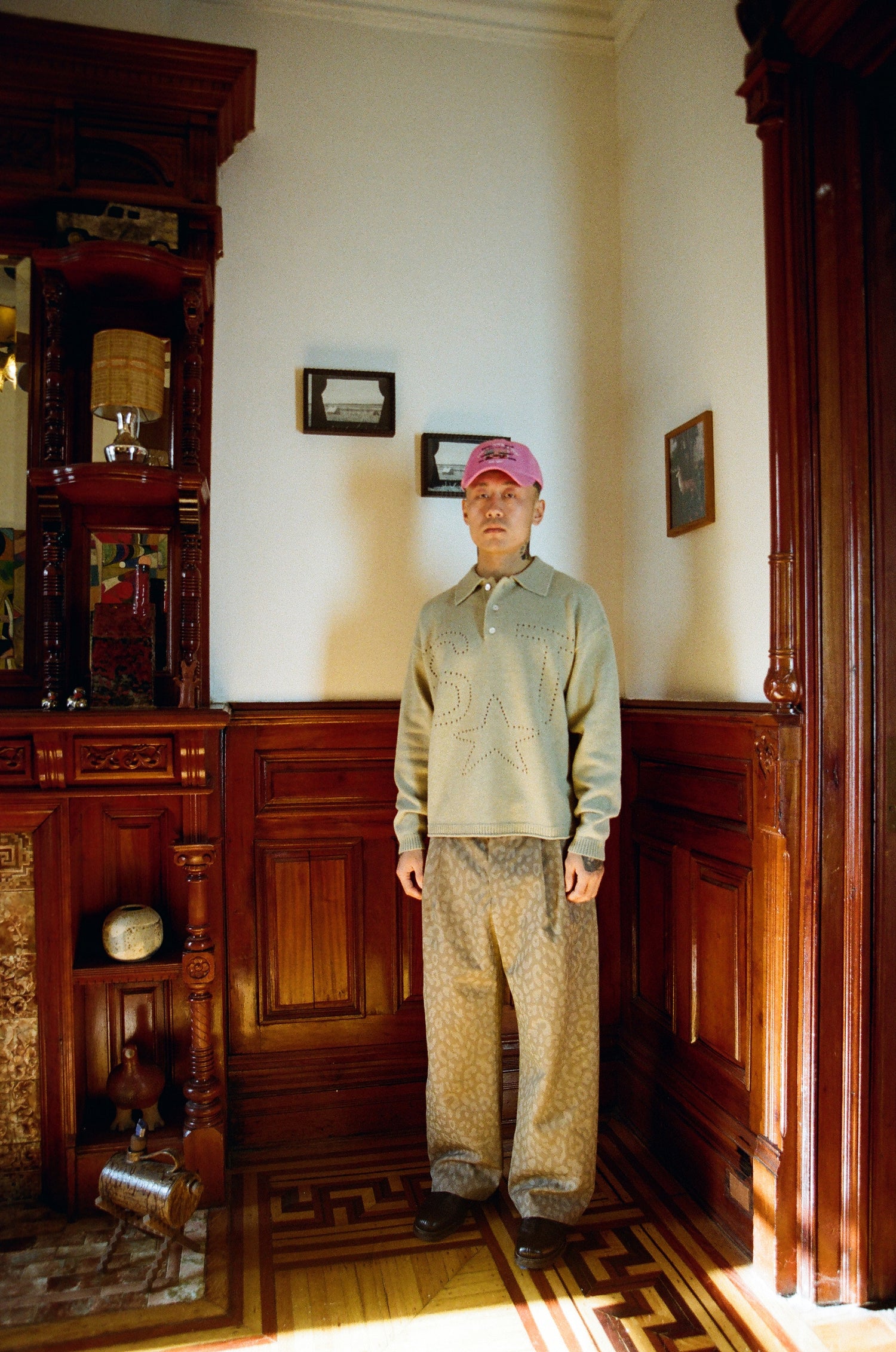 Wide leg suit pant with double pleat front and lightly curved outseam shape. Cut in a Japanese wool with alternating warp and weft tones for a lightly iridescent quality. Like the Cornucopia Burn cords, this fabric has been custom laser etched with a leopard print and washed before construction.
