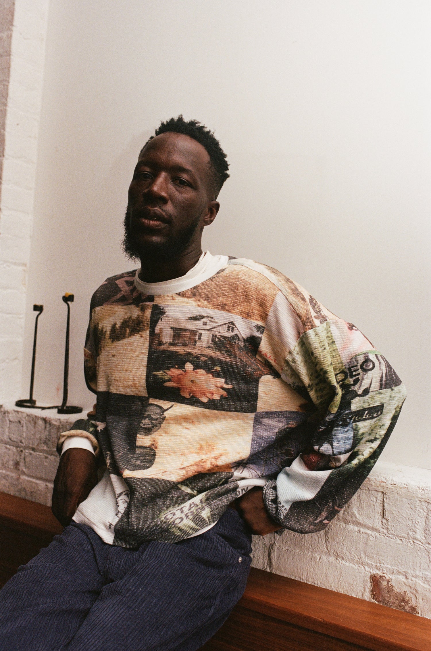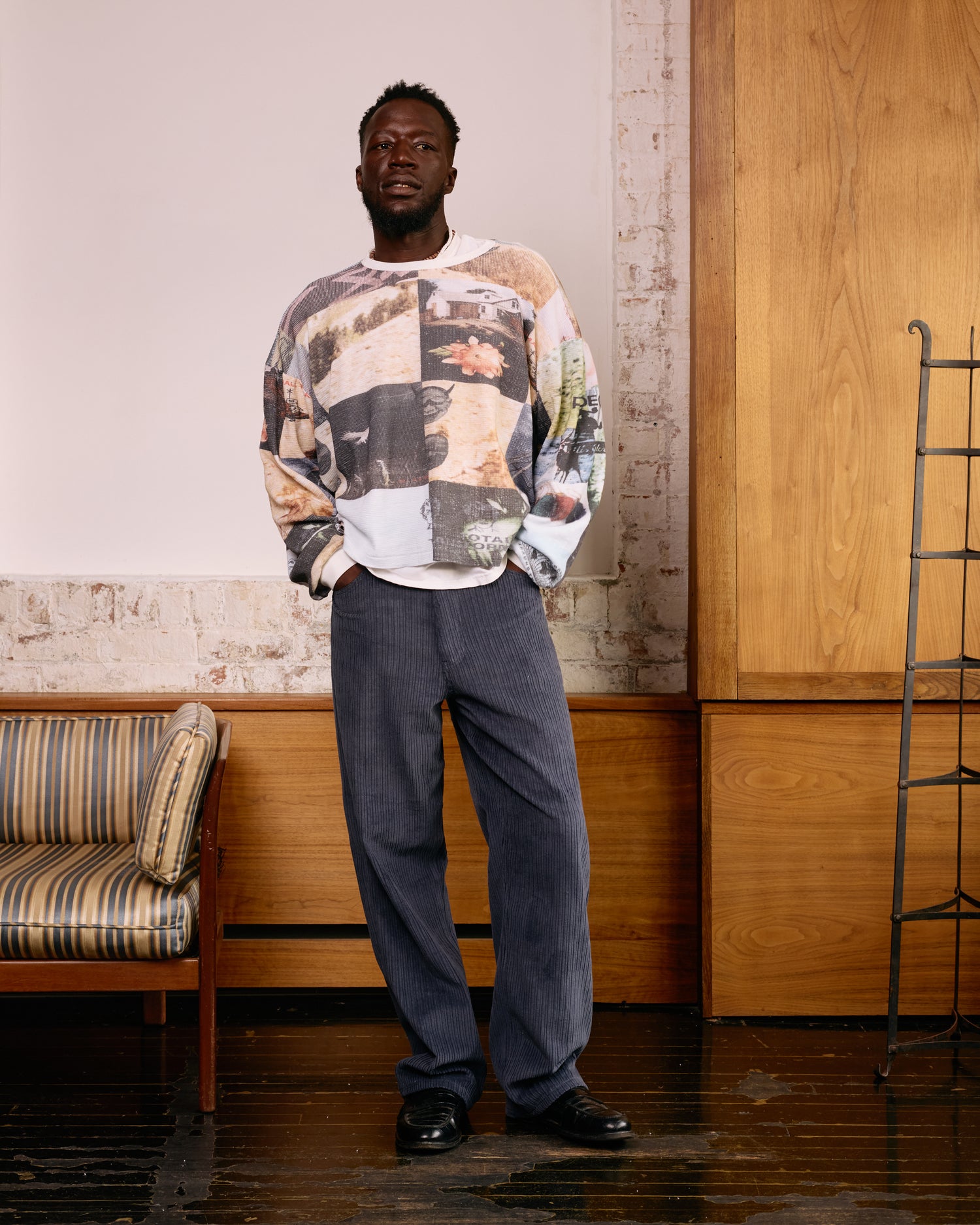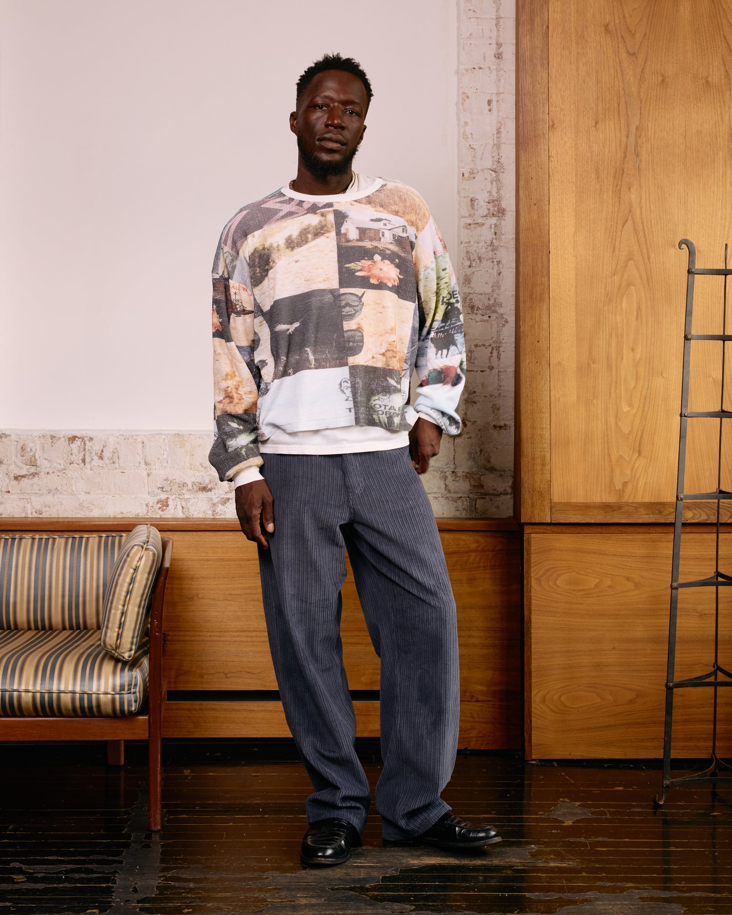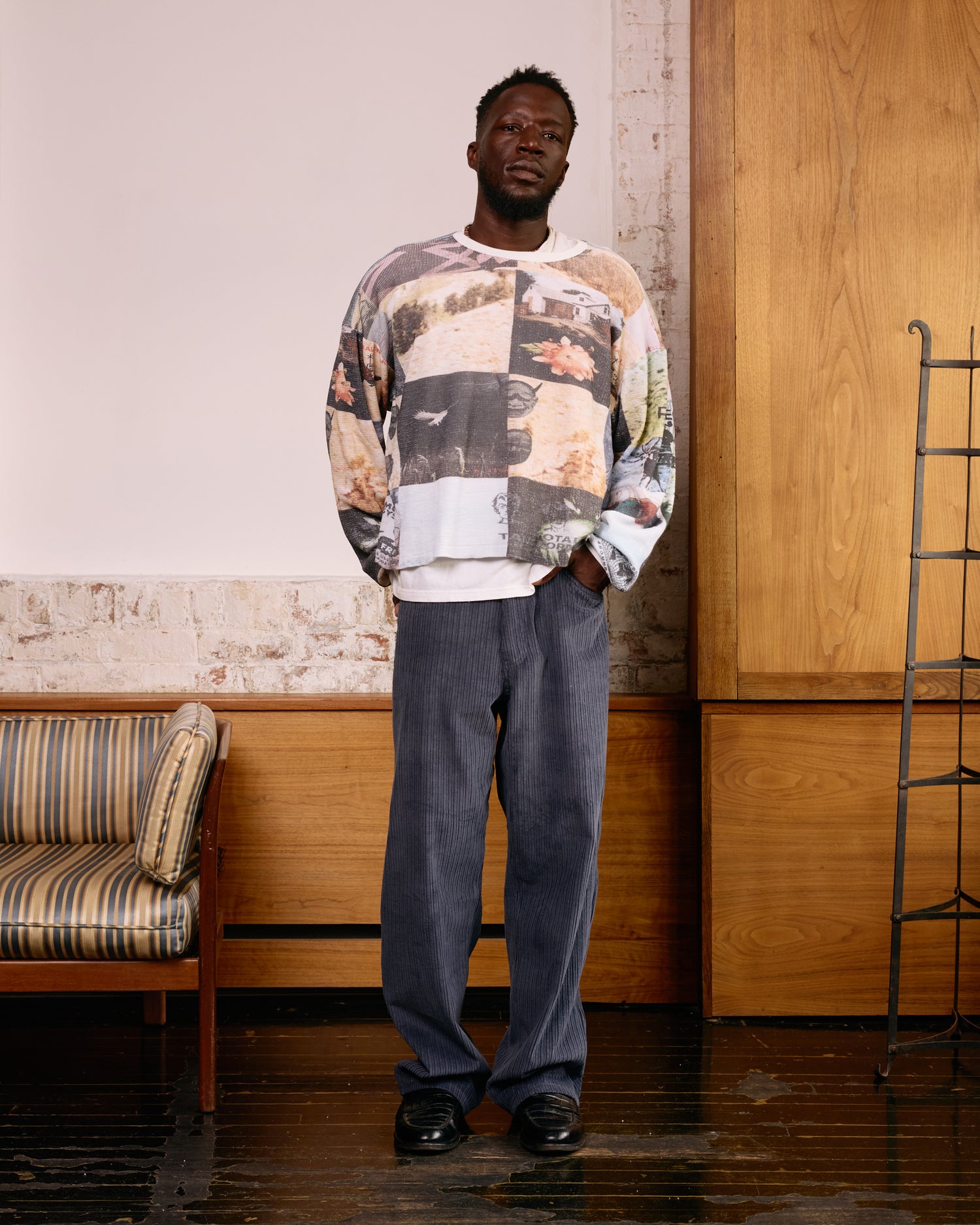 Cotton thermal long sleeve shirt, custom printed with the moodboard that birthed this whole collection. So much of the reference material that very loosely inspires a collection like this just sits with us, and while we're mostly ok with that, sometimes we want it to be seen in all it's self-referential glory. We like the idea that all of this gets condensed into an overall feeling that informs everything in the collection indirectly, and we also like the idea of making a physical document, or in this case, garment, out of the reference material that's meant to live in the background.